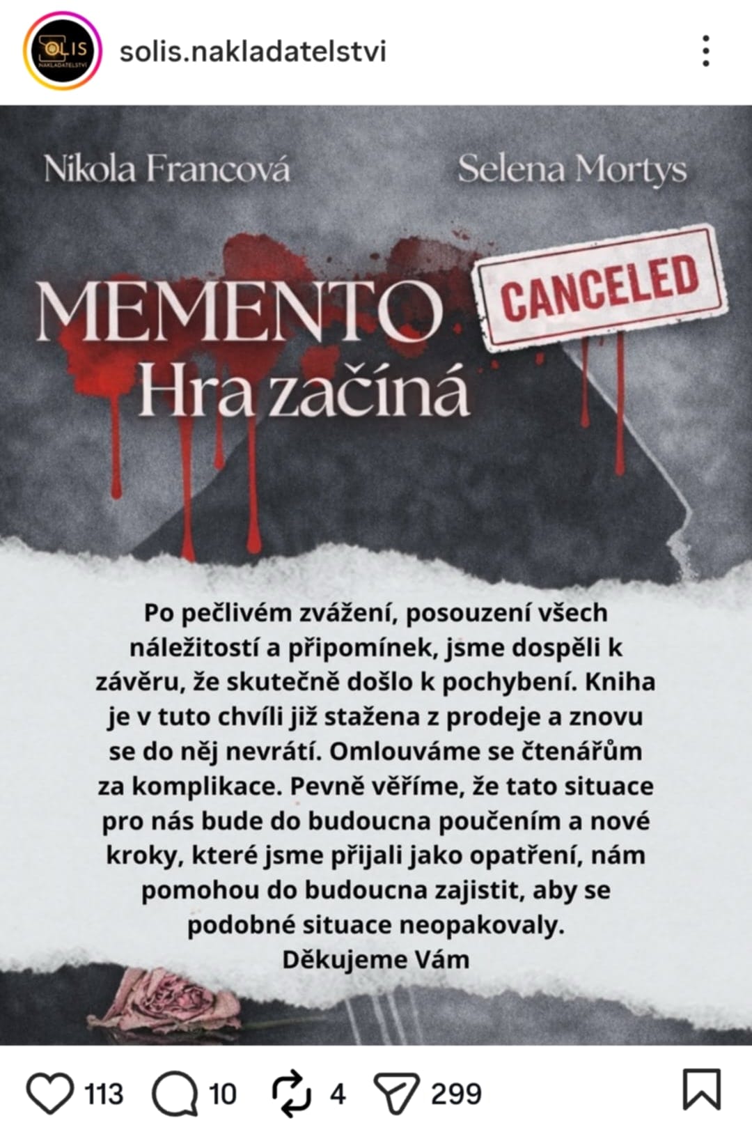 Memento mori je e-kniha vydaná na konci roku 2025 nakladatelstvím Solis, v pořadí jako jejich 121. e-kniha. Uváděnými autorkami jsou Nikola Francová a Selena Mortys. A právě první jmenovaná mi napsala e-mail (v podstatě i druhá jmenovaná, protože jde o jednu a tutéž osobu), na jehož základě jsem ji požádal, zda by mi neposkytla PDF verzi knihy, která se dostala ke čtenářům a stala se za nedlouho předmětem opravdu bouřlivé debaty.
