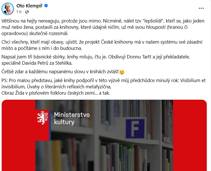 Poznámka pod čarou... Ministr nemá rozhodovat o tom, jaký film dostane dotaci či jaká kniha bude podpořena. Od toho jsou komise složené z odborníků a různých názorů. V minulém roce rozhodovala komise a nikoliv ministr. Není férové, když se vytváří opačný dojem. A ze zajímavosti jsem se podíval na obě citované knihy. A vypadají naprosto super. Navíc odborně zpracovávající důležitá témata.