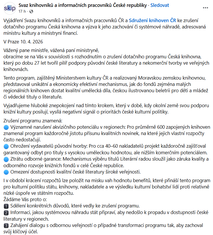 Pojďme si ovšem rozebrat konkrétní zrušení programu a čtyři body, které Svaz knihovníků uvedl jako hlavní dopad.