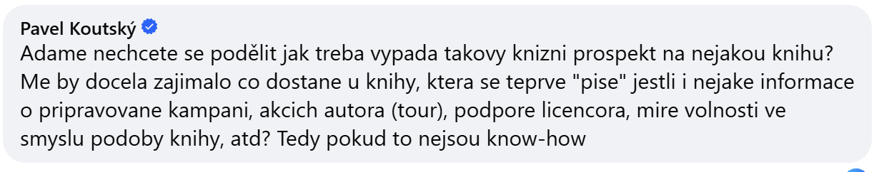 Doplnění. Pavel se zeptal na dobrou otázku. Co vlastně dostaneme? Je to velmi rozdílné. Když je to HODNĚ dobré, tak máme A4 barevnou prezentaci knihy, kde máme informaci i autorovi, zhruba tři odstavce o knize, obálku, fotku autora, informace do jakých zemí je prodáno a jak jsou na tom televizní práva. To jsou ovšem prezentace, které dostáváme zhruba na jedné z 20 knih. Většinou se listuje katalogem či podobnými materiály, kde je maximálně: