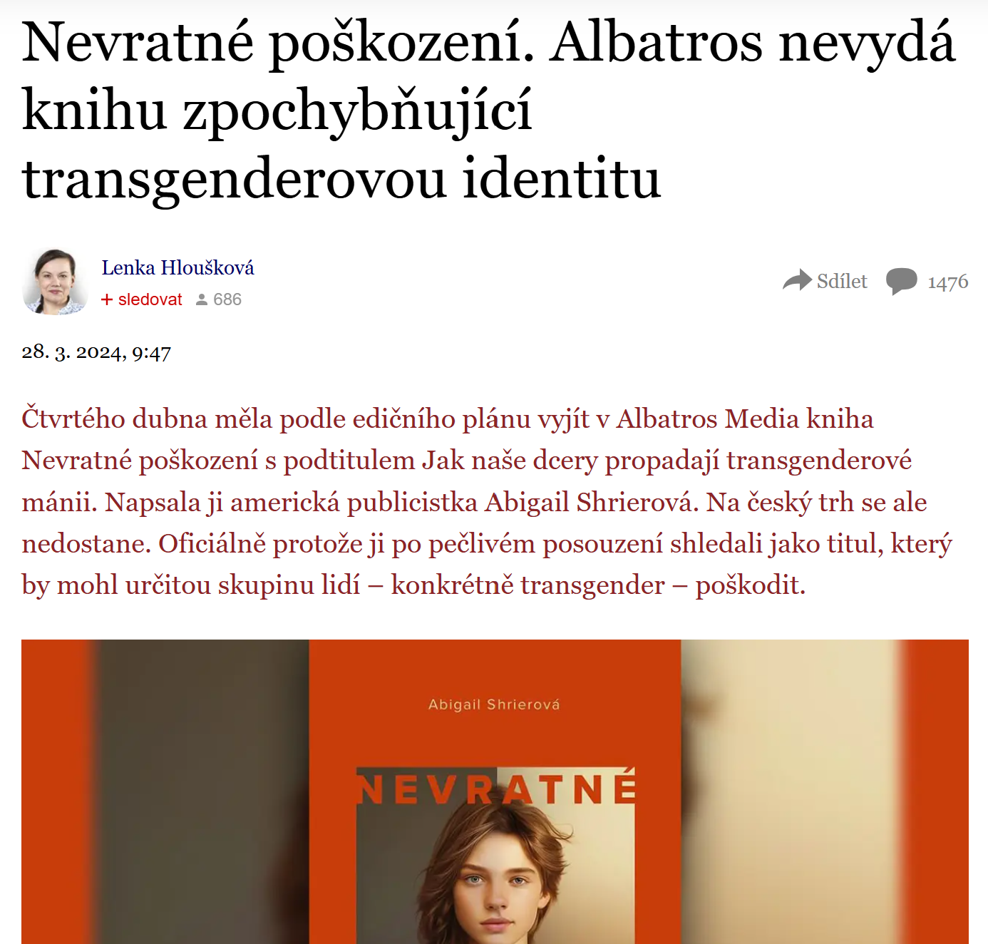 Za poslední roky mi v paměti velmi silně utkvěla jedna konkrétní kauza, která rozhodně není černobílá, ale na českém knižním trhu představuje poměrně unikátní situaci. V roce 2024 se zvedla výrazná vlna nevole proti záměru vydání knihy Nevratné poškození, která se věnuje problematice změny pohlaví a tématu transgender. Autorka se v knize snaží popsat fenomén rychle narůstajícího počtu mladých lidí, kteří podstupují sociální nebo medicínskou tranzici, a klade otázky po dlouhodobých dopadech těchto rozhodnutí.
